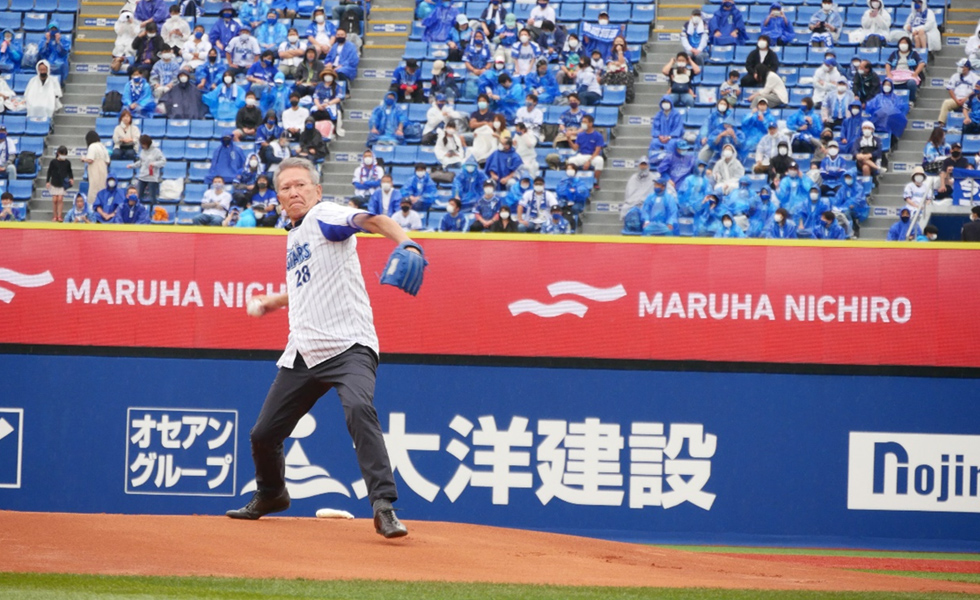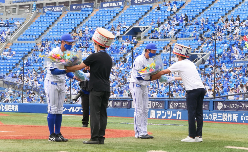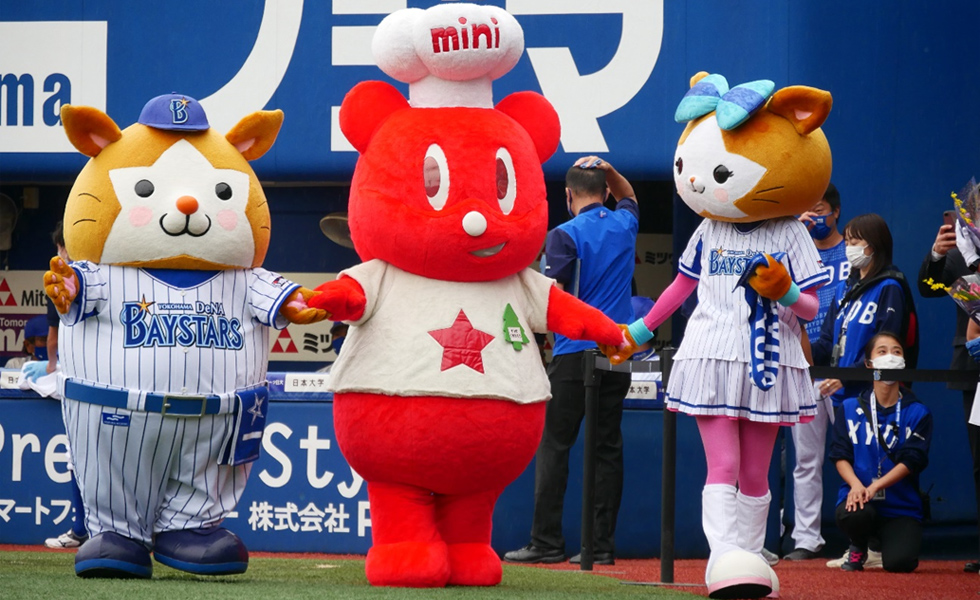 DeNAベイスターズ選手への花束贈呈を、冷凍食品キャラクター「森のくまたろう」がDB.スターマンたちとともにイベントを盛り上げました。