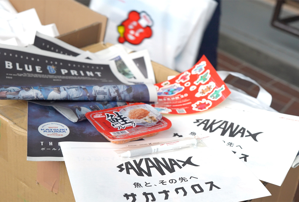 先着20,000人の来場者へ「鮭フレーク トレー」やオリジナルロゴ入りボールペン、誕生魚®ステッカーをプレゼント。球場内大型ビジョンでは、新しい「SAKANA X SPORTS」のイメージ動画や、企業CM「バリューチェーン」シリーズが放映されたほか、リボンビジョンには「サカナクロス」のロゴも掲出されました。当社は2022年、魚とさまざまなテーマや物事を掛け合わせることで、魚の多様な価値を発信するアクション「サカナクロス」を推進してまいります。