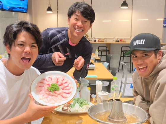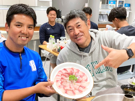 11月に初めて納品された養殖魚は、青星寮の加々美(かがみ)料理長が腕によりをかけて、クロマグロは刺身、ブリはしゃぶしゃぶ、カンパチはカルパッチョに調理され、選手・コーチ・スタッフの皆さんに堪能いただきました。