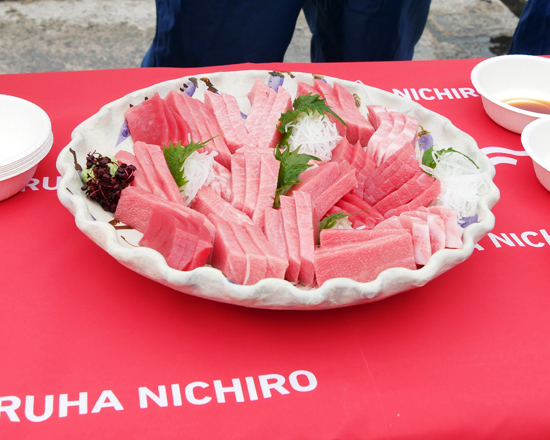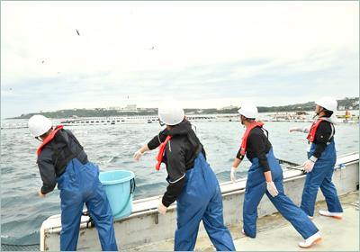 毎年、球団は1軍の春季キャンプに参加する新人選手の「初休日」に、沖縄ならではのアクティビティを用意しています。そんな中、今年はグループ会社の大洋エーアンドエフ(株) 沖縄事業所に4名の新人選手が来訪し、養殖クロマグロへの餌やりを体験するとともに、新鮮で脂ののったマグロを試食しました。