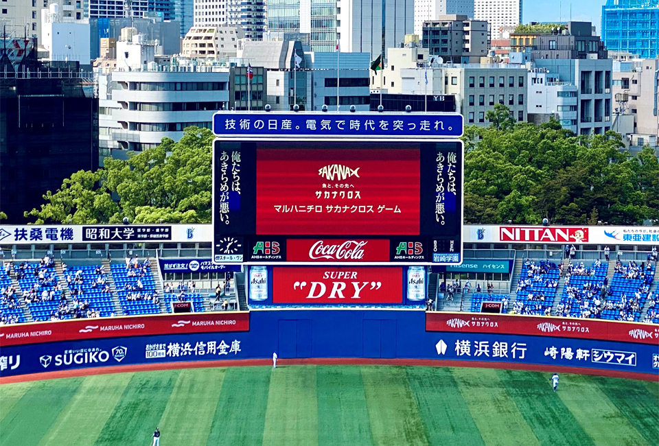 当日は先着20,000名様にサカナクロス タブロイド紙(Vol.4)とフリーズドライの新商品「鯛のあら汁仕立て」が配布されました。球場内大型ビジョンでは企業CM「未来に、幸あれ。サステナブル」編や、横浜流星さんが出演する市販用冷凍食品のTV-CMが放映されたほか、リボンビジョンには当社ロゴや「サカナクロス」のロゴが掲出されました。