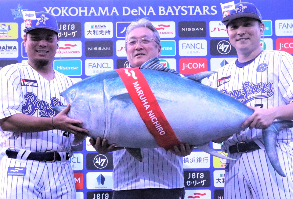 試合は、先発・濱口遥大選手が8回途中1失点の好投を見せると、打線は1-1で迎えた5回に、3連続タイムリーが飛び出すなど5点を奪いました。その後、6-4とリードを守り切った横浜DeNAベイスターズは見事勝利を手にし、今シーズンのUmios冠試合、全勝となりました!試合後には池見社長が、当試合のヒーローに選ばれた濱口選手と佐野選手に、ヒーロー賞として当社の完全養殖クロマグロ1本分を贈呈しました。