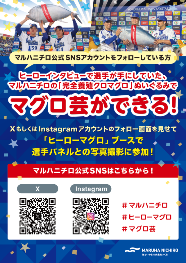 UmiosのSNSアカウント(XもしくはInstagram)をフォローすると、Umios「完全養殖クロマグロ」を模したぬいぐるみと写真が撮れるフォトブース「ヒーローマグロ」ブースを実施いたします。 選手パネルの前で、ヒーロー賞さながらに撮影が体験できるブースにぜひご参加ください。